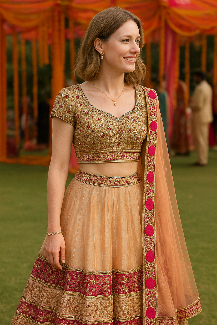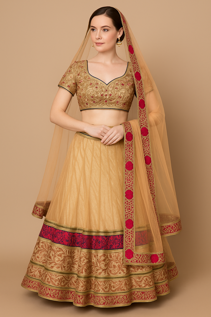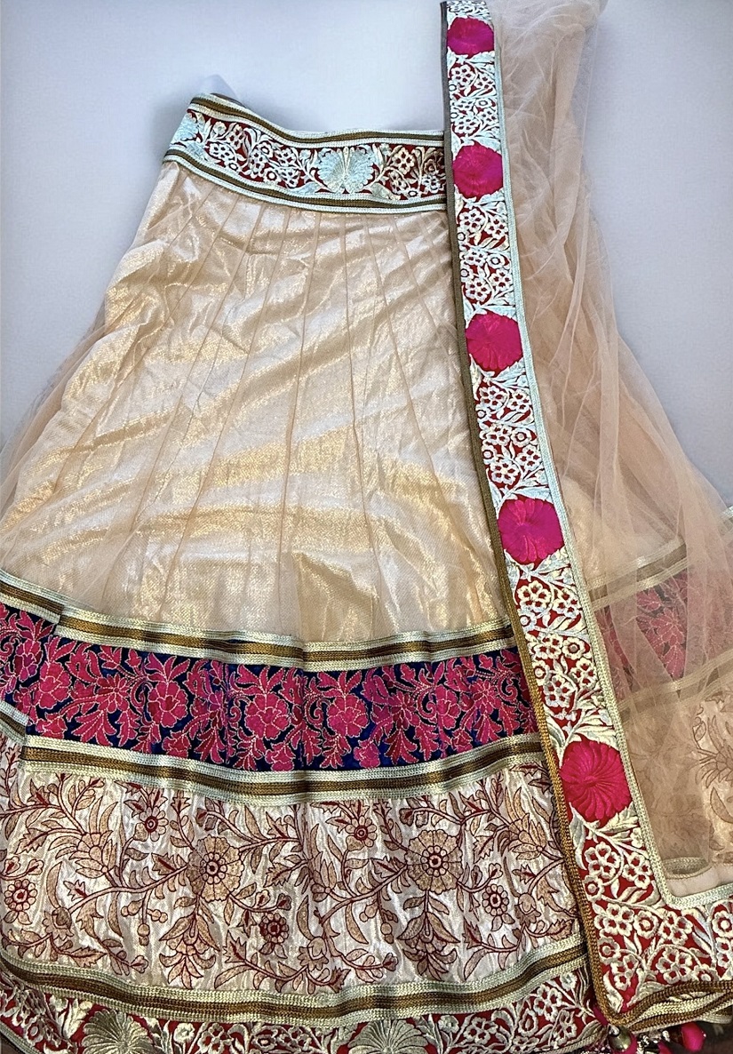 • This beautiful Golden Ivory lehenga is sure to get you noticed at any celebration. Featuring gold and hot pink embroidery in its fully embellished border. This lehenga has been paired with jewelled embroidered blouse and a matching dupatta.